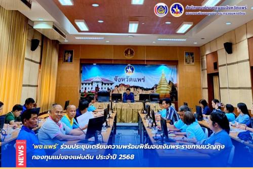 นายวีรกานต์ บุญตัน พัฒนาการจังหวัดแพร่ พร้อมด้วย นางสาวสุรางคนา ภักดี ผู้อำนวยการกลุ่มงานสารสนเทศการพัฒนาชุมชน ประธานเครือข่ายกองทุนแม่ของแผ่นดินจังหวัดแพร่ วิทยากรกระบวนการกองทุนแม่ของแผ่นดิน นักวิชาการพัฒนาชุมชนผู้รับผิดชอบงานกองทุนแม่จังหวัดและอำเภอ เครือข่ายกองทุนแม่จังหวัดแพร่ และประธานหมู่บ้านต้นกล้ากองทุนแม่ของแผ่นดินจังหวัดแพร่ ประจำปี 2568 ร่วมประชุมเตรียมความพร้อม การจัดพิธีมอบเงินพระราชทานขวัญถุงกองทุนแม่ของแผ่นดิน ประจำปี 2568 โดยมีกำหนดวันที่ 16 กันยายน 2568 ณ หอประชุมตรีเทพ สถาบันนวัตกรรมด้านป่าไม้จังหวัดแพร่