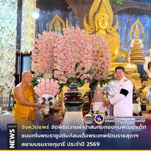 นายสมชัย เลิศประสิทธิพันธ์ ผู้ว่าราชการจังหวัดแพร่ เป็นประธานฝ่ายฆราวาสในพิธีทอดผ้าป่าสมทบกองทุนพัฒนาเด็กชนบท ในพระราชูปถัมภ์สมเด็จพระเทพรัตนราชสุดาฯ สยามบรมราชกุมารี ประจำปี 2569 โดยได้รับเมตตาจาก พระราชเขมากร เจ้าคณะจังหวัดแพร่ และเจ้าอาวาสพระอารามหลวงวัดพระบาทมิ่งเมืองวรวิหาร เป็นประธานฝ่ายสงฆ์ เพื่อหารายได้สมทบกองทุนพัฒนาเด็กชนบทในพระราชูปถัมภ์ สมเด็จพระเทพรัตนราชสุดาฯ สยามบรมราชกุมารี ในการช่วยเหลือพัฒนาเด็กที่ครอบครัวมีฐานะยากจนและด้อยโอกาส เป็นการสนับสนุนการ พัฒนาเด็กก่อนวัยเรียน อายุตั้งแต่แรกเกิดถึงหกปี ในกรณีที่เงินสนับสนุนของภาครัฐไม่เพียงพอ โดยในปีนี้มีประชาชนผู้มีจิตศรัทธาร่วมสนับสนุนเงินสมทบกองทุน รวมทั้งสิ้น 821,273.71 บาท